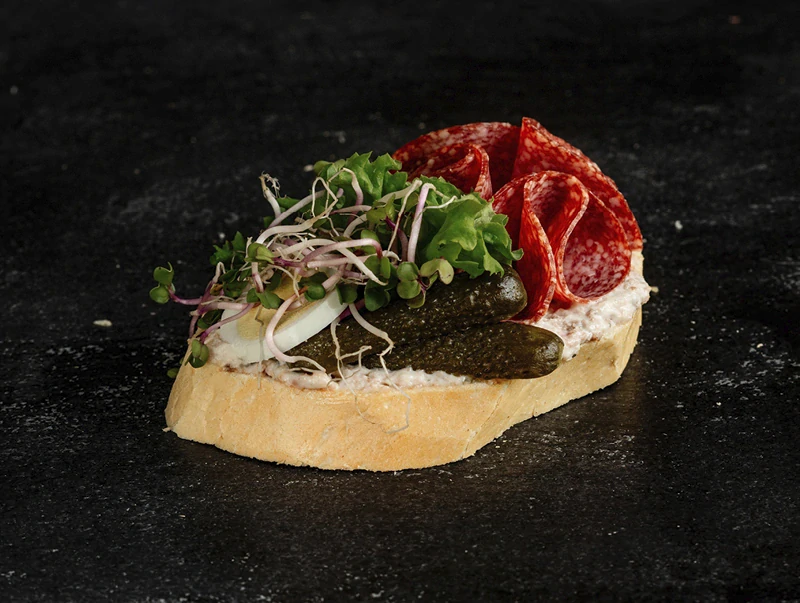 Chlebíček s Herkulesem je lahůdka pro milovníky výraznějších chutí. Na tradiční vece potírané salámovou pomazánkou podáváme plátky voňavého salámu Herkules, které dodávají chlebíčku plnou a kořeněnou chuť. Dozdobený nakládanou okurkou, klíčky, vajíčkem a čerstvým salátem působí krásně barevně a zároveň vyváženě.