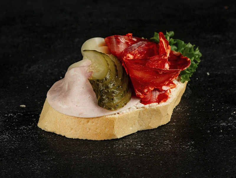 Poctivá klasika v moderně vylepšené podobě. Kombinace kvalitní dušené šunky, pikantního choriza a jemného sýru Eidam vytváří plnou a výraznou chuť, kterou skvěle doplňuje náš tradiční chlebíčkový salát.