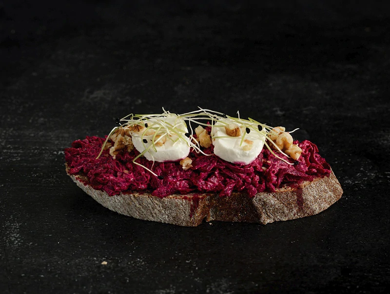 Originální kombinace pro milovníky výraznějších chutí. Jemná pomazánka z červené řepy přináší lehce nasládlý tón, který se dokonale snoubí s lehce pikantním čerstvým kozím sýrem.