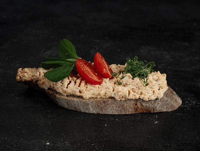 Dopřejte si chlebíček s jemně krémovou pomazánkou ze sušených rajčat, která vyniká plnou a výraznou chutí. Podáváme ho na tmavém podmáslovém chlebu, jenž dodá každému soustu příjemnou vláčnost a lehce domácí vůni.