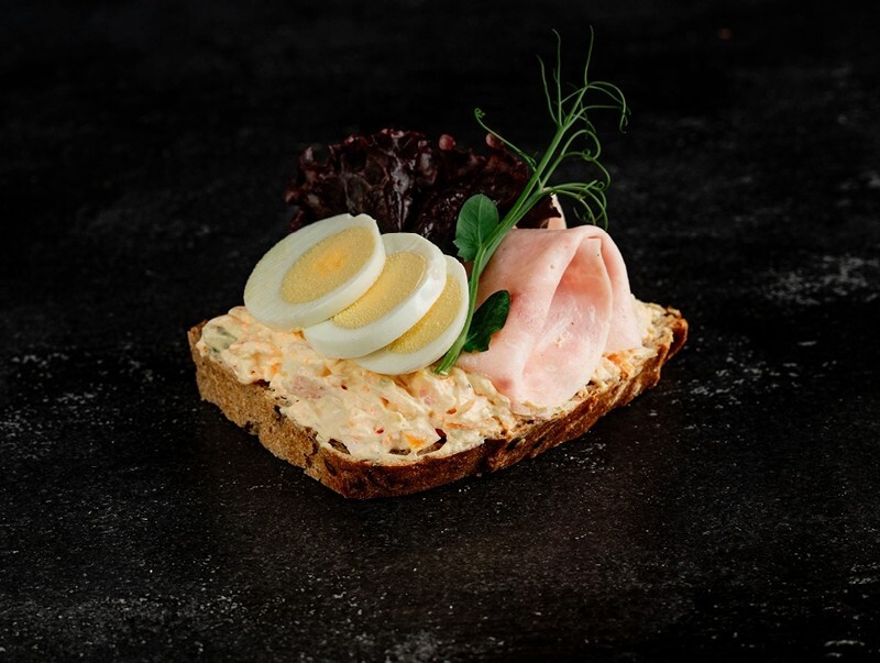 Poctivý žitný chlebíček od Koláčků s bohatou a chuťově vyváženou pomazánkou. Základ tvoří jemná směs z lučiny, mrkve, šunky, sýru Eidam a vajíčka, která dodává chlebíčku plnou a příjemně svěží chuť.