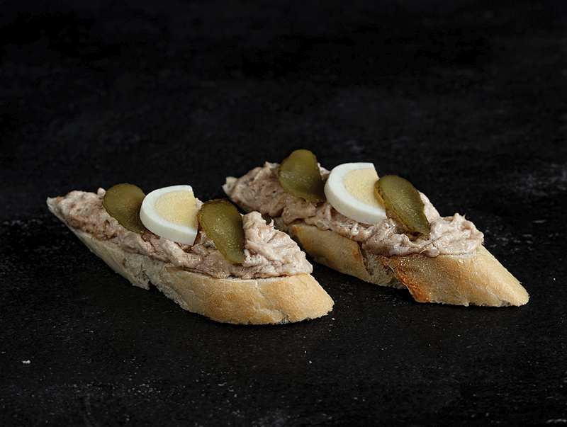 Tuňáková dvojhubka je malá, ale výrazně chutná pochoutka, perfektní jako lehké pohoštění na rodinné oslavy, firemní akce i přátelská setkání. Na francouzské světlé bagetě roztíráme jemnou tuňákovou pomazánku a dozdobujeme ji plátkem vajíčka a nakládanou okurkou, které dodají svěží kontrast.