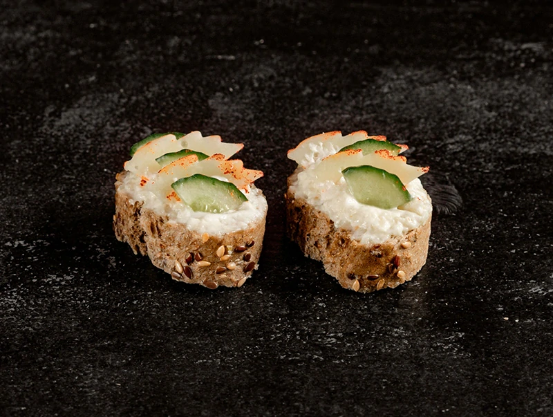 Sýrová jednohubka je malá, ale výrazná chuťovka, která nesmí chybět na rodinných oslavách, přátelských setkáních ani firemním cateringu. Na kornové tmavé bagetce roztíráme česnekovo-sýrovou pomazánku, která dodává plnou, krémovou a lehce pikantní chuť. Dozdobená plátkem eidamu a salátovou okurkou působí svěže a krásně vyváženě.