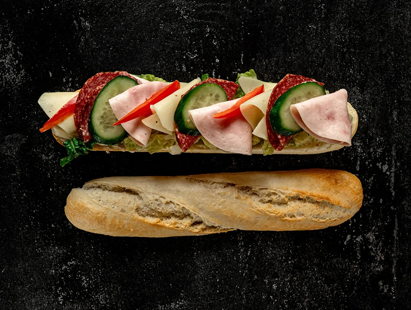 Poctivá obložená francouzská bageta ideální pro rychlé a chutné pohoštění. Křupavá bageta je jemně vymazaná máslem a bohatě obložená dušenou šunkou, salámem Herkules a sýrem eidam. Chuť vyvažuje čerstvá zelenina – římský salát, okurka a paprika.