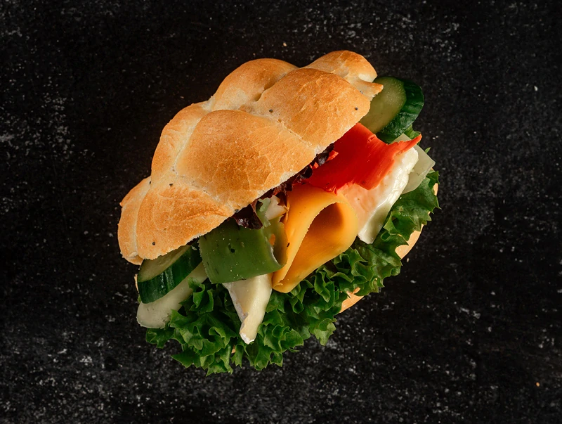 Čerstvá houska je mazána máslem a bohatě obložena výběrem sýrů – Cheddar, Eidam, Gouda a Brie. Vše je doplněno salátovou okurkou a čerstvým listovým salátem, které dodají housce svěžest a lehkost.